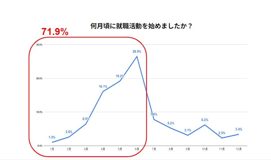 「就職活動を始めた時期」に関する質問では、2023年の6月が26.5%と最も多く、全体では2023年6月までに始動する学生が71.9%でした。約7割の学生が、3年生の6月には就職活動を開始していることがわかりました。