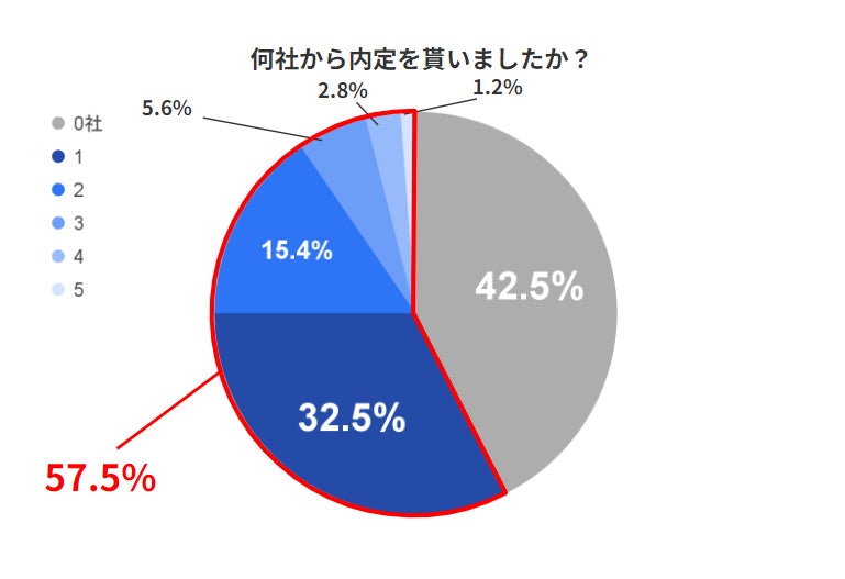 「何社から内定をもらったか」について尋ねたところ、「1社」(32.5 %)「2社」(15.4%)「3社以上」が9.6%と、すでに内定を獲得している学生が全体の57.5%を占めました。