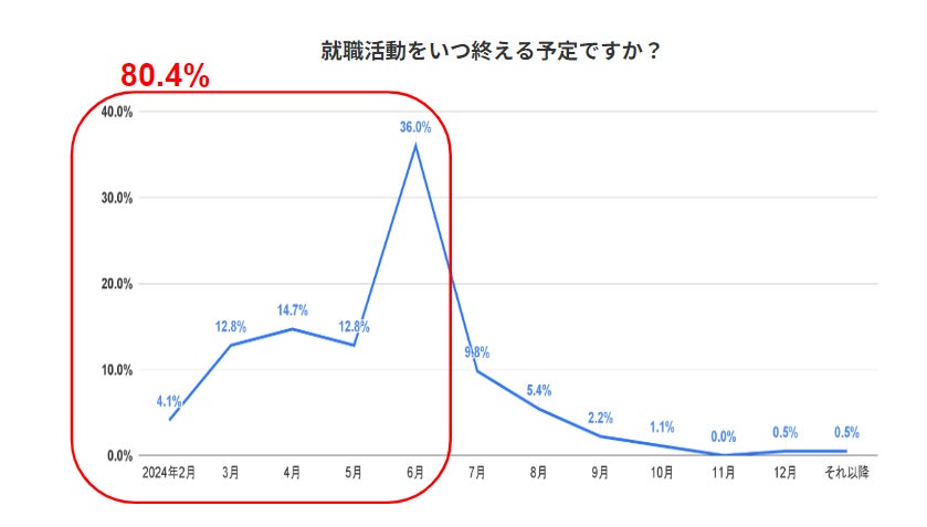 「就職活動を終える予定」に関する質問では、「2024年の6月」が36.0%と最も多く、全体では2024年6月までに終えたいと考える学生が80.4%でした。2023年の6月までに就職活動を開始する学生が全体の約7割であることを踏まえると、約1年間就活を続けている学生が多いことが明らかになりました。