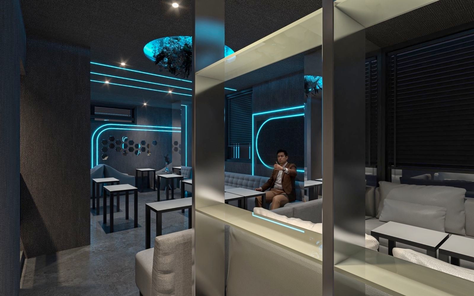 ブルーのネオンが印象的なモノトーン空間は、カフェの居心地とバーの非日常を融合。