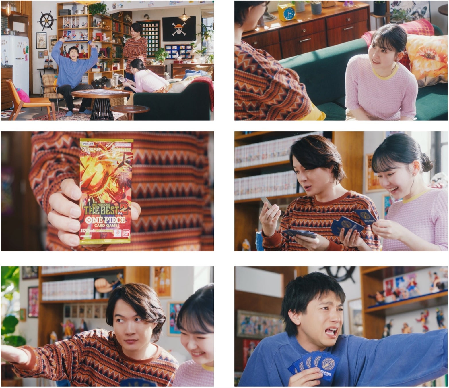 ついにスタートデッキを手にし、兄の山田裕貴さんに勝負を挑む杏奈さん。くしくも負けてしまい、「私勝ちたいです!」とONE PIECEカードゲームに躍起になる杏奈さんに、神木さんがプレミアムブースターをすすめます。杏奈さんが次々に強力なカードを引き当てる姿に、裕貴さんは思わず焦り、コミカルなリアクションを連発。杏奈さんの勢いに押される裕貴さんに、神木さんが「ドンマイ、裕貴」と、親指を立てて”グッド”ポーズを見せて裕貴さんをさりげなく励ますシュールな場面で締めくくられる、さりげないユーモアが効いたオチが印象的なCMとなっています。