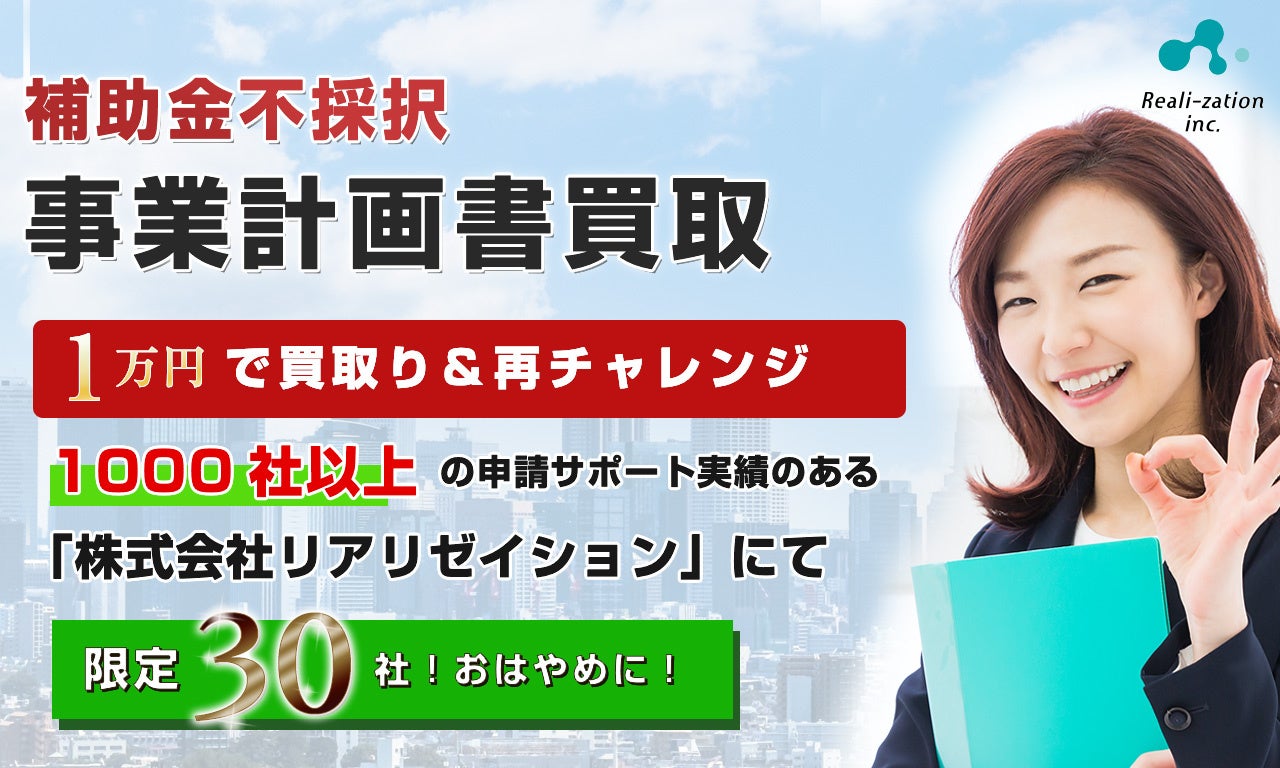 「世界一優しい行政手続きに」をキャッチコピーとする、株式会社リアリゼイション(本社:東京都渋谷区)は、補助金に関する「不採択事業計画書」の買取&再チャレンジサービスを開始いたしました。(30社限定)