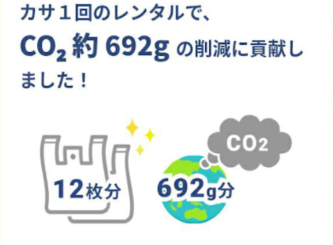 アイカサを1回傘をレンタルすると無駄な傘ゴミを削減すると同時に、使い捨て傘1本分約692g*のCO2削減につながり、脱炭素社会に貢献します。