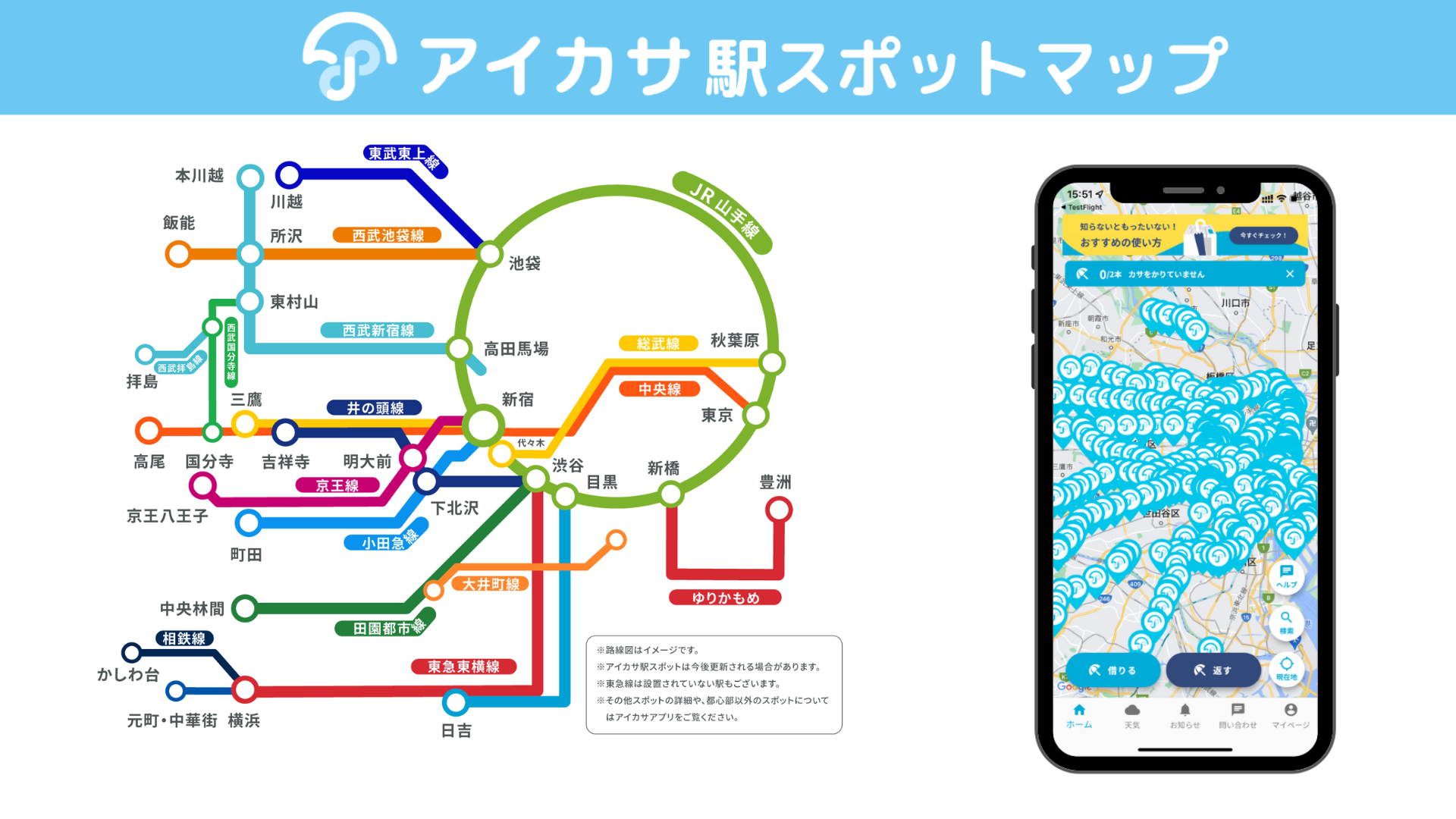 突発的な雨にもビニール傘をその都度購入せずに、駅や街中で丈夫なアイカサを借り、雨が止んだ際には最寄りの傘スポットに傘を返却することで手ぶらで便利に移動ができるのが特徴です。