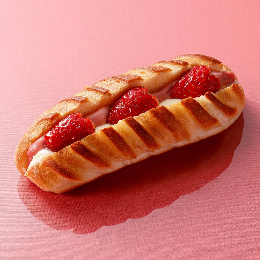 「いちごミルクヴィエノワ」は、ミルク生地のパンに練乳クリームといちごクリームを挟み入れ、王道のいちごミルクを表現したパンです。ハート型の生いちごで華やかに仕上げました。