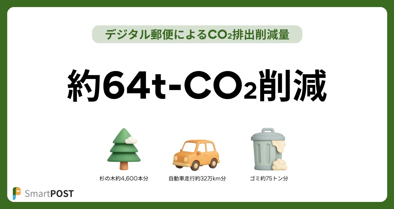 この削減量は、杉の木約4,600本が1年間に吸収するCO2量、自動車で地球を約8周(約32万km)走行する際に排出されるCO2量、およびゴミ約75トンを焼却する際に発生するCO2量に相当し、自治体からの郵便物のデジタル化が環境負荷の低減にもつながっていることを示しています。