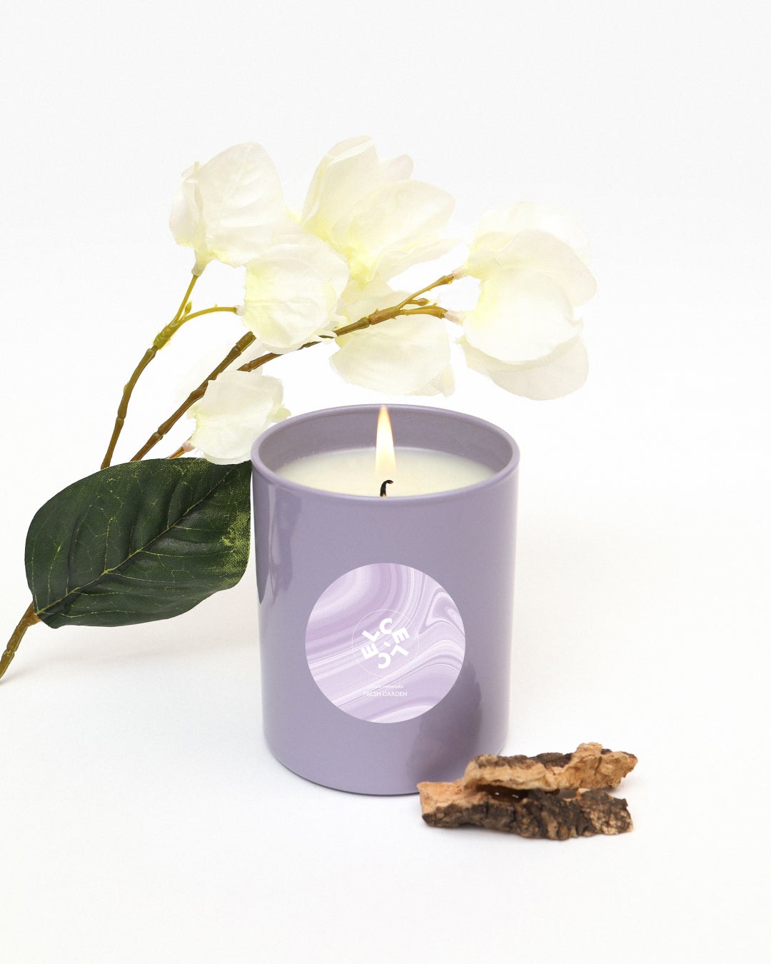 キャンドルはパープルをベースに、マーブル柄のラベルを採用し、見た目でも楽しめるデザインに。