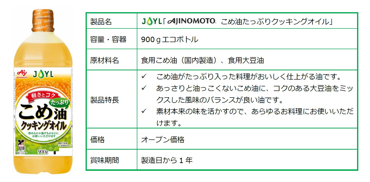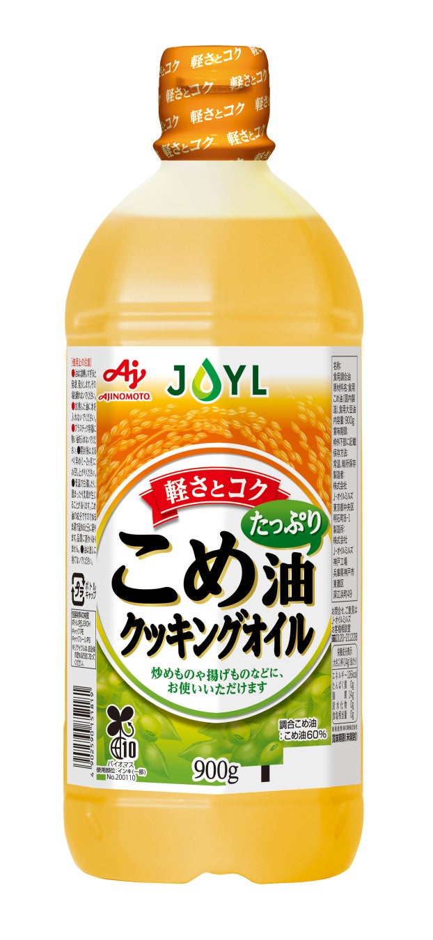 今回新たに発売するJOYL「AJINOMOTO こめ油たっぷりクッキングオイル」は、こめ油がたっぷり入った、料理がおいしく仕上がるクッキングオイルです。あっさりと油っこくないこめ油に、コクのある大豆油をミックスしており、風味のバランスが良く、素材本来の味を活かすので、あらゆる料理にお使いいただけます。
