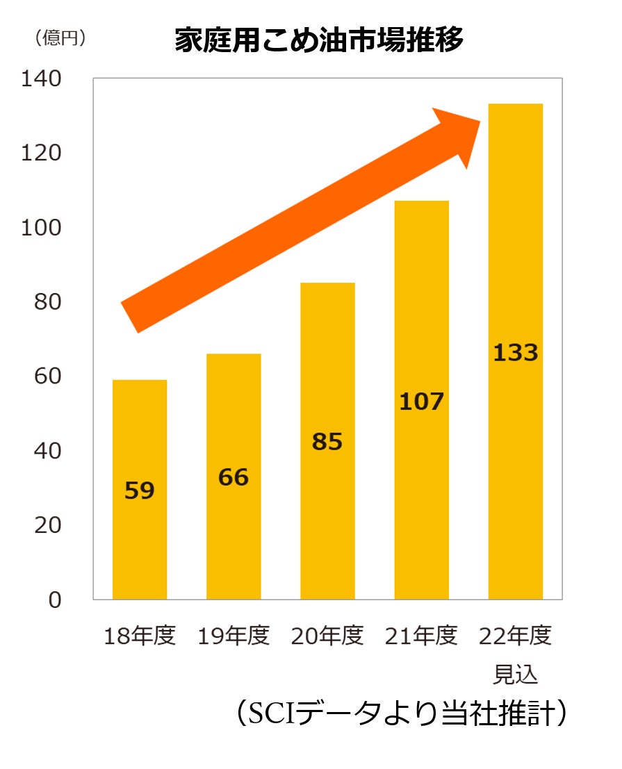 近年、健康イメージ※や原料のわかりやすさに加え、サラダ油やキャノーラ油と同様に汎用的な使い方ができることが支持され、家庭用こめ油市場は拡大しています。2018年度から2021年度までの年平均成長率は22%であり、今後もこの傾向は継続する見込みです。
