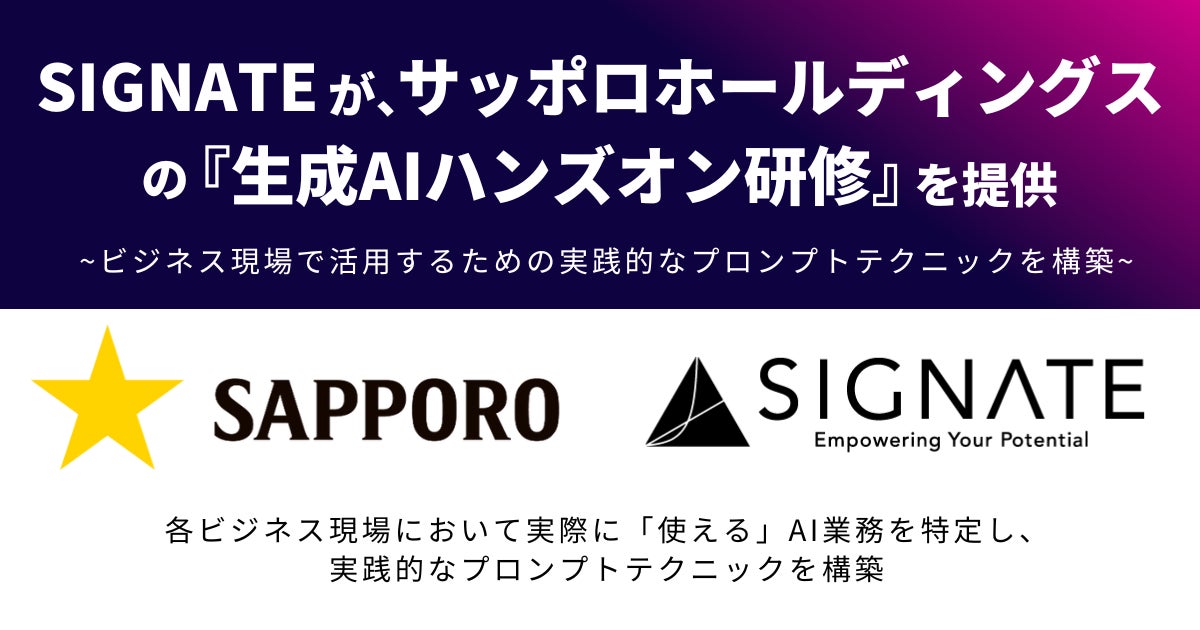 AI開発・運用、DX人材育成を手掛ける株式会社SIGNATE(本社:東京都千代田区、代表取締役社長:齊藤 秀、読み方:シグネイト、以下 SIGNATE)は、サッポロホールディングス株式会社(東京都渋谷区、代表取締役社長:尾賀真城、以下 サッポロホールディングス)が進める『生成AI試験導入』において、各部署の業務に特化したカスタムプロンプトの開発と、社内での活用を推進するための人材育成を支援いたします。