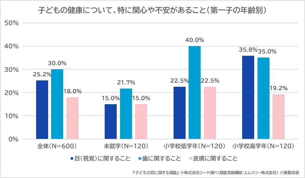 保護者に対して「子どもの健康について、特に関心や不安があること」を聞いたところ、1位の「歯」(30.0%)に次いで、2位に「目」(25.2%)が挙がりました。特に小学生までの子どもでは、未就学児から小学校低学年・高学年へと成長するにつれて、「子どもの目」への関心や不安が高まる傾向が見られました。