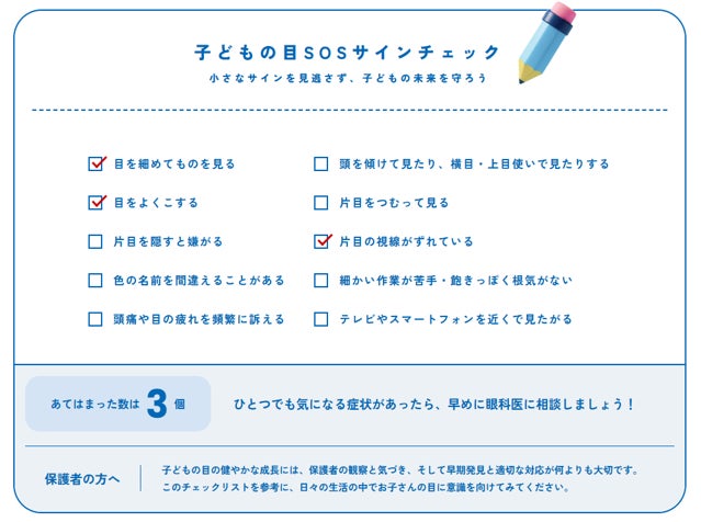 子どもの視力や目の不調は、本人が自覚しにくく、周囲も気づきにくいケースが少なくありません。そこで、日常生活のなかで見逃されがちな目の不調のサインにいち早く気づくためのチェックシート「子どもの目SOSサインチェック」を公開しました。