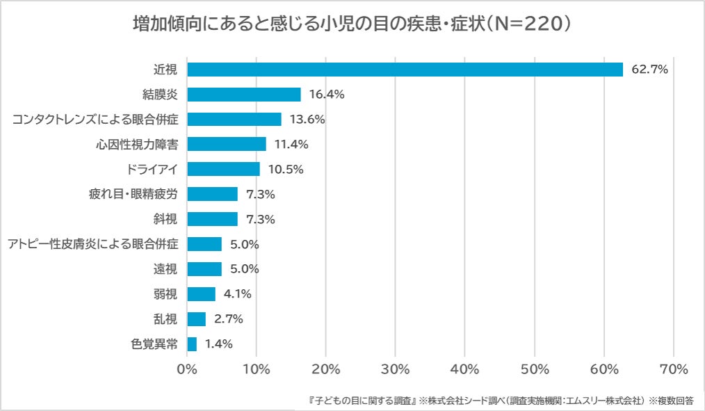 コンタクトレンズの製造販売を行う株式会社シード(本社:東京都文京区、代表取締役社長:佐藤 隆郎、東証プライム市場:7743)は、「SEEDこどものめ未来プロジェクト」において、「子どもの目に関する調査」を実施し、眼科医が「増加傾向にあると感じる小児の目の疾患・症状」のなかでも「近視」は62.7%と最も多く、その他でも「結膜炎」や「コンタクトレンズによる眼合併症」、「心因性視力障害」、「ドライアイ」、「疲れ目」、「斜視」等、幅広い目の悩みが顕在化していることが分かりました。