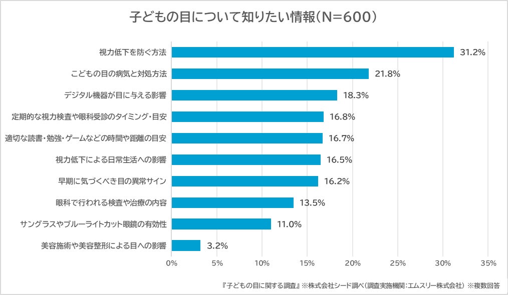 また、保護者が「子どもの目について知りたい情報」としては、「視力低下を防ぐ方法」(31.2%)が最も多く、次いで、「子どもの目の病気と対処方法」(21.8%)となりました。保護者は、子どもの目に関心や不安を抱き、何をすればよいのか、どのように守ればよいのかという“正しい知識”を求めていることが分かります。