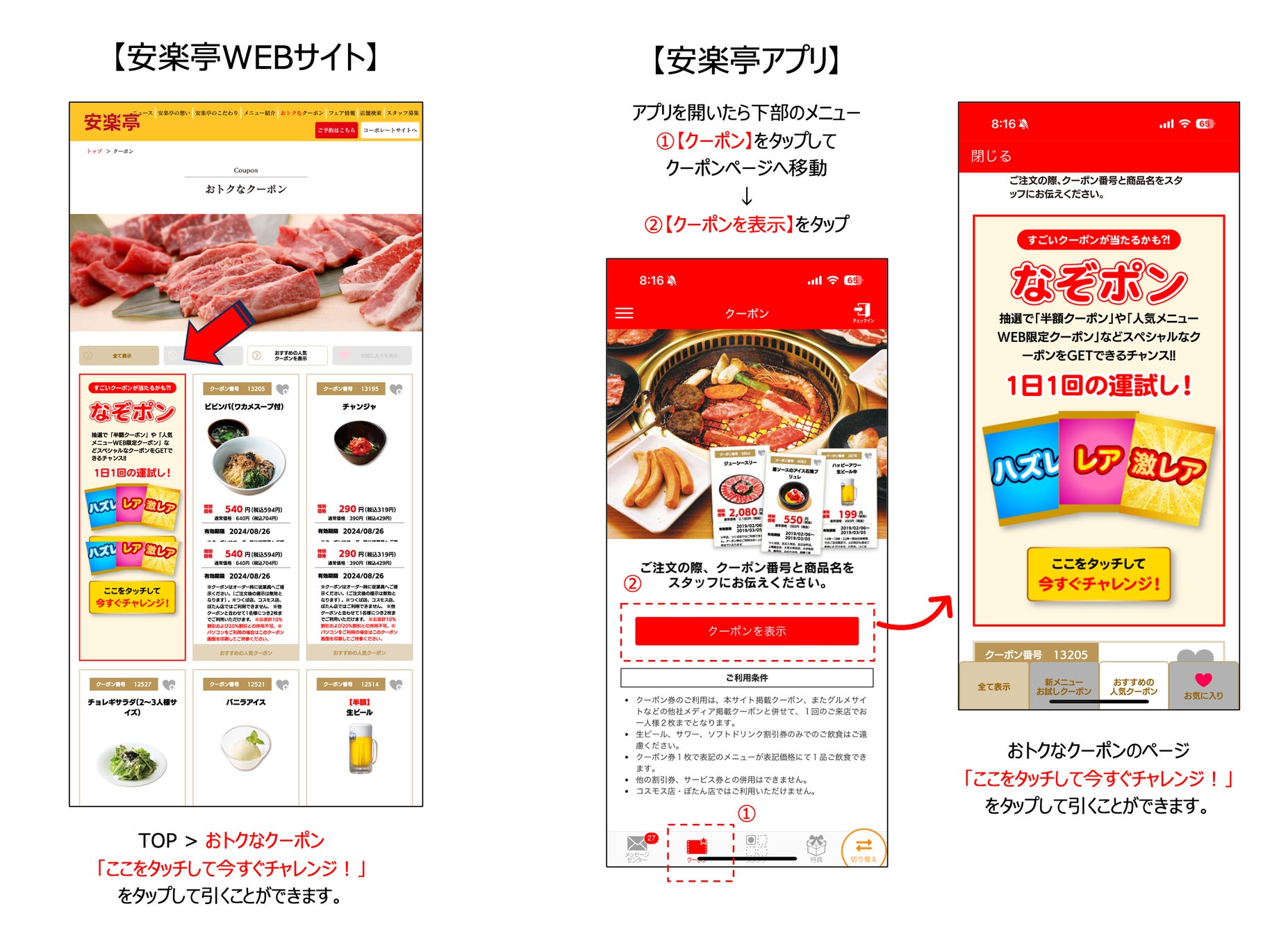 ①安楽亭アプリまたは安楽亭公式WEBサイトで1日1回引くことができます。