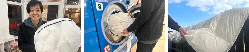 ※家庭用の洗濯機だと、容量や洗浄力・乾燥力が足りず生地の痛みや匂いが発生する場合がございます。洗濯は必ずコインランドリーで行ってください。