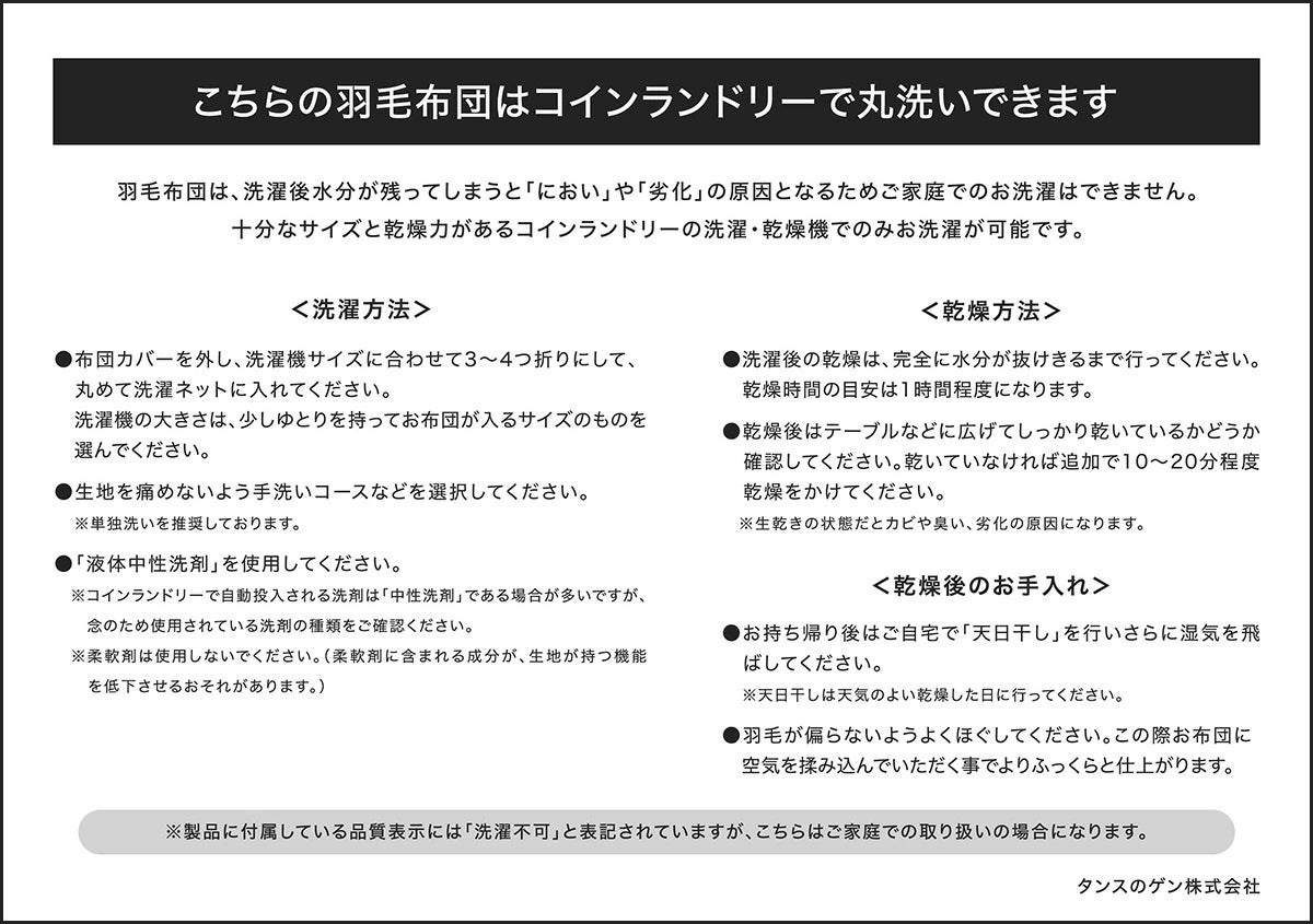 羽毛布団の洗濯が初めての方や不安がある方でも安心して洗っていただけるよう、「コインランドリーで洗える羽毛布団」には洗濯の手引きをお付けしております。コインランドリーの洗濯機の設定や、乾燥の際の注意、自宅に持ち帰った後のお手入れ方法についても記載しておりますので、安心して取り扱いいただけます。