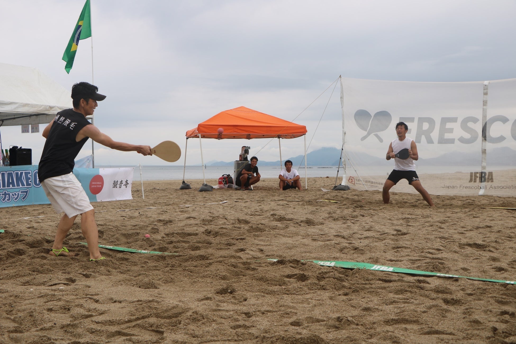 フレスコボールは、ブラジルのリオデジャネイロ発祥のビーチスポーツです。1945年にリオ・デ・ジャネイロのコパカバーナビーチで考案され、現在は世界各地のビーチで親しまれるようになっています。フレスコボールの最大の特徴は、向かい合う2人が競い合うのではなく、協力してラリーを続ける採点競技という点。競技時間は5分間、7mの距離を保って試合を行います。