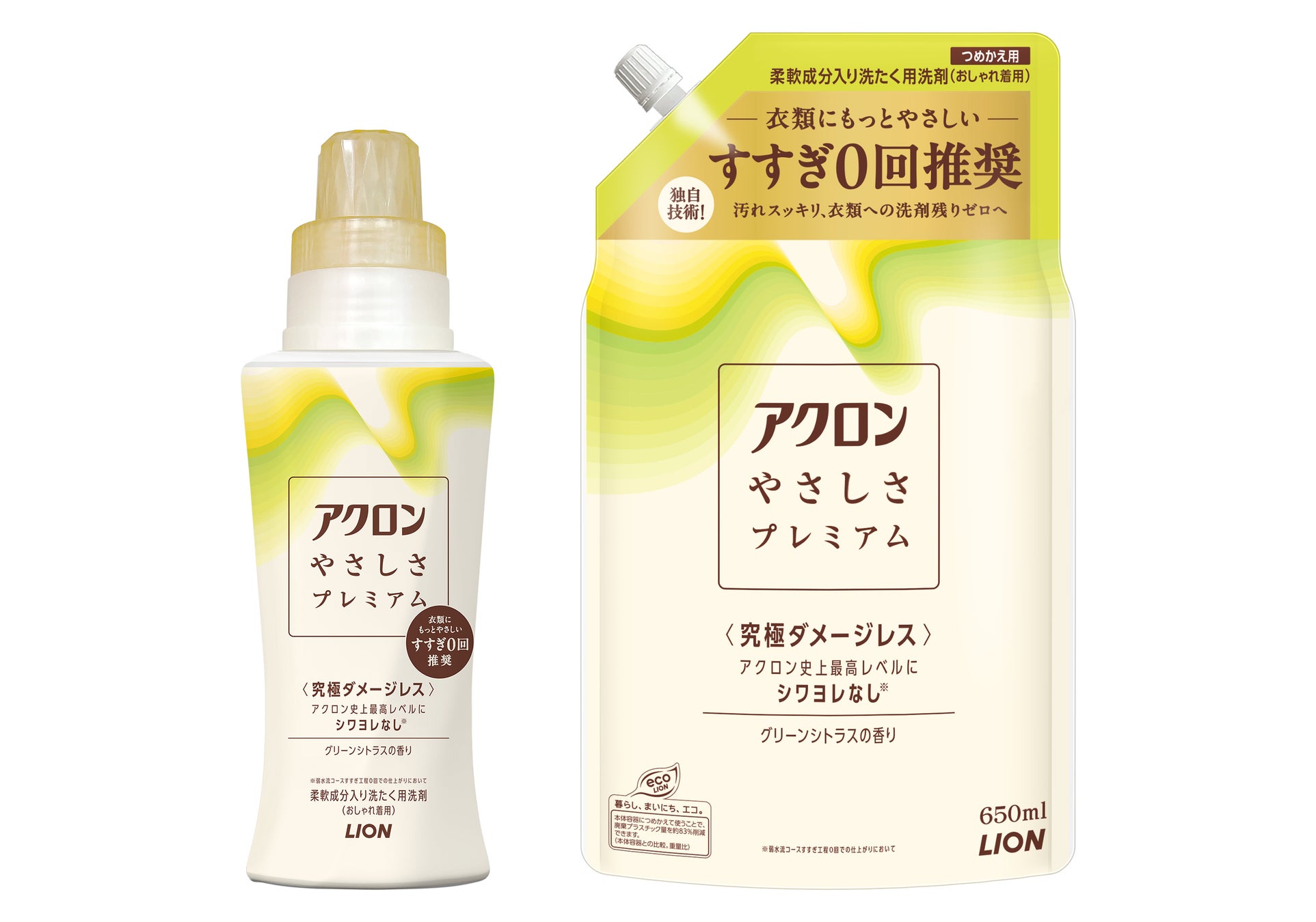 ライオン株式会社(代表取締役兼社長執行役員:竹森 征之)は、すすぎ0回の洗濯で、お気に入りの衣類を様々なダメージ(シワ・ヨレ・型崩れ・縮み・色あせ・毛玉)から守り、ワンランク上の仕上がりを実現する柔軟成分入り洗濯用洗剤(おしゃれ着用)『アクロンやさしさプレミアム』を、2025年4月9日(水)から全国にて新発売いたします。