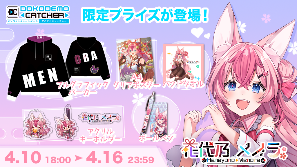 株式会社DC7(本社:京都府京都市 運営:大阪府大阪市)が運営するオンラインクレーンゲーム「どこでもキャッチャー」と、仙狐になるために人間界に修業をしにきた妖狐Vtuber「花代乃メノラ」さんとのコラボイベント開催をお知らせします。