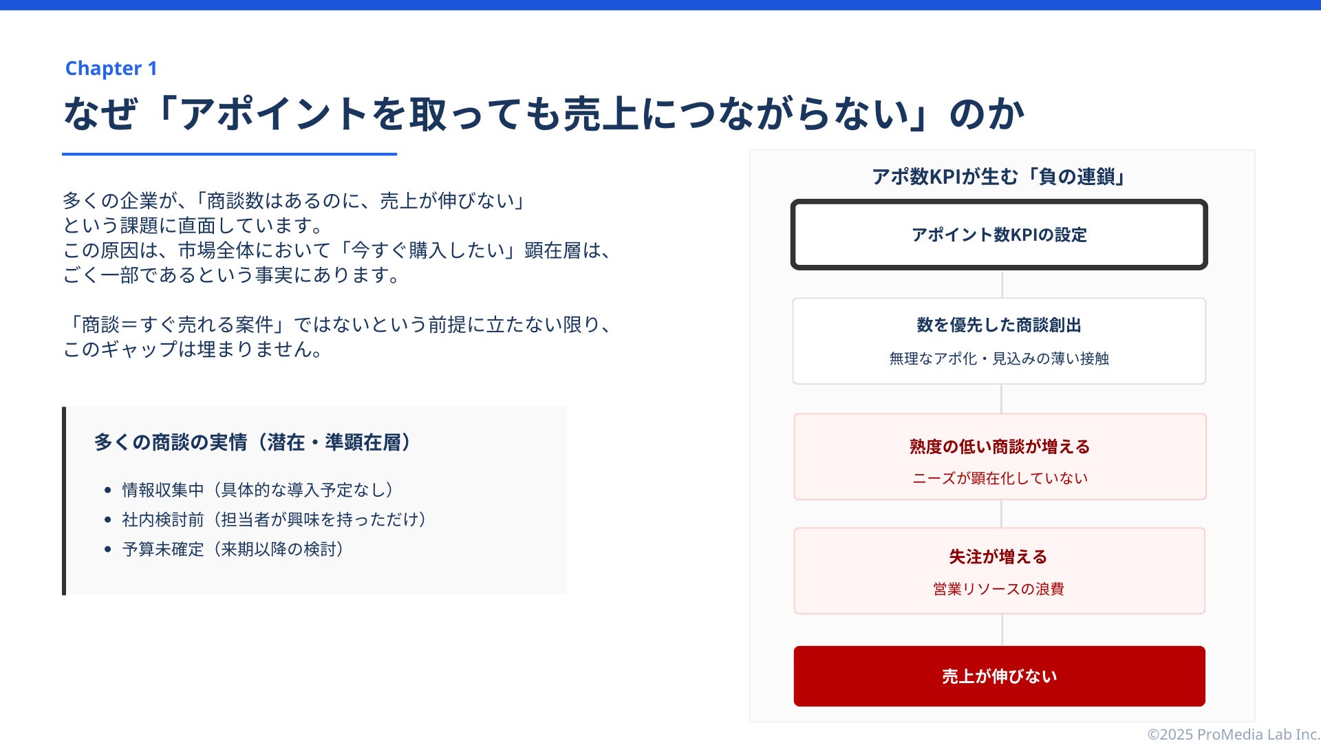 その背景には、アポイント数KPIが、短期的な“数合わせ”の行動を促してしまっている構造があります。