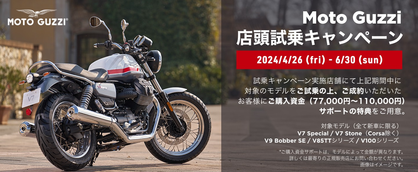 キャンペーン内容: 期間中にキャンペーン実施販売店にてモト・グッツィをご試乗の方が、期間中に 試乗店舗にて対象モデルの新車をご成約された場合、モデルに応じた購入サポー ト金をプレゼント※いたします。