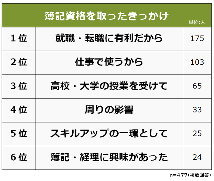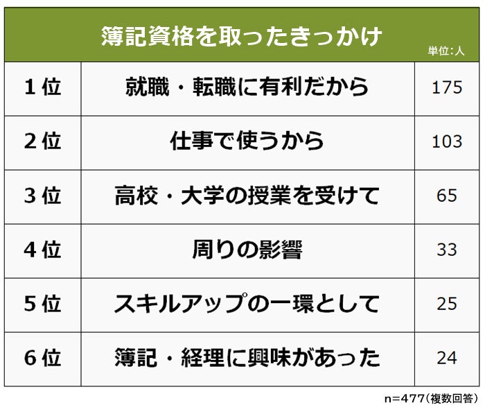 簿記の資格をもっている477人に「簿記資格を取ったきっかけ」を聞いたところ、1位は「就職・転職に有利だから(175人)」でした。