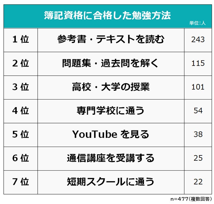 簿記の資格をもっている477人に「簿記資格に合格した勉強方法」を聞いたところ、1位は「参考書・テキストを読む(243人)」でした。