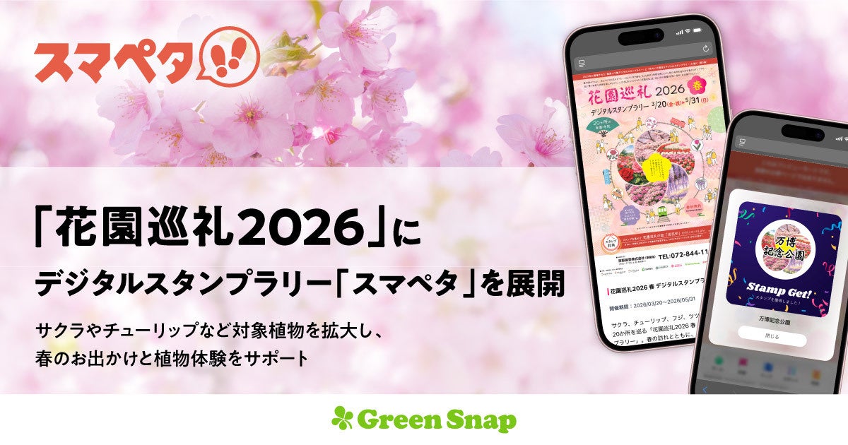 GreenSnap株式会社「GreenSnap」を運営するGreenSnap株式会社(本社:東京都中央区、代表取締役:西田貴一)は、京阪園芸株式会社が事務局を務める「花園巡礼2026実行委員会」が3月20日(金)から5月31日(日)まで開催する「花園巡礼2026 春 デジタルスタンプラリー」において、当社が提供する多機能デジタルスタンプラリーサービス「スマペタ」を提供し、植物愛好家を中心とした多くの方々へ春のお花巡りの楽しさを届けてまいります。