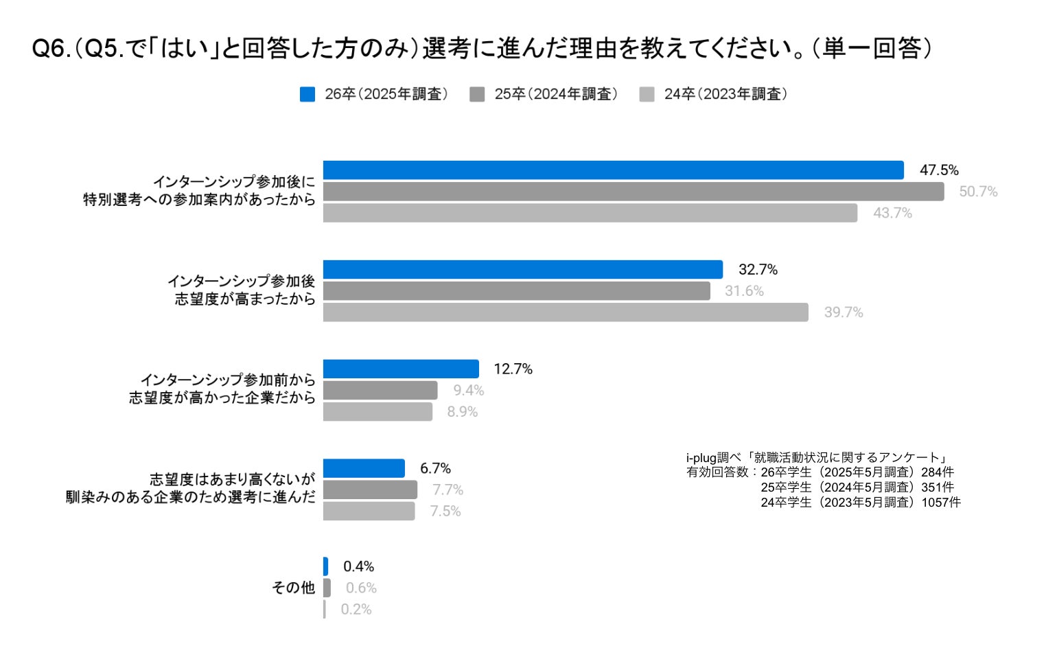 「インターンシップ参加後に特別選考への参加案内があったから」が最多の47.5%。インターンシップ後の企業からの案内が、選考に参加する意思に影響することが推察できます。
