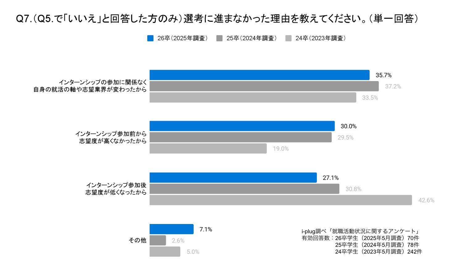 一方で、「インターンシップ参加後、志望度が低くなったから」は、24卒学生を対象に実施した同様の調査と比べると、約15.5ポイント減少しました。以前と比べて、インターンシップへの参加が、学生の志望度に良い影響を与えていることが推察できます。