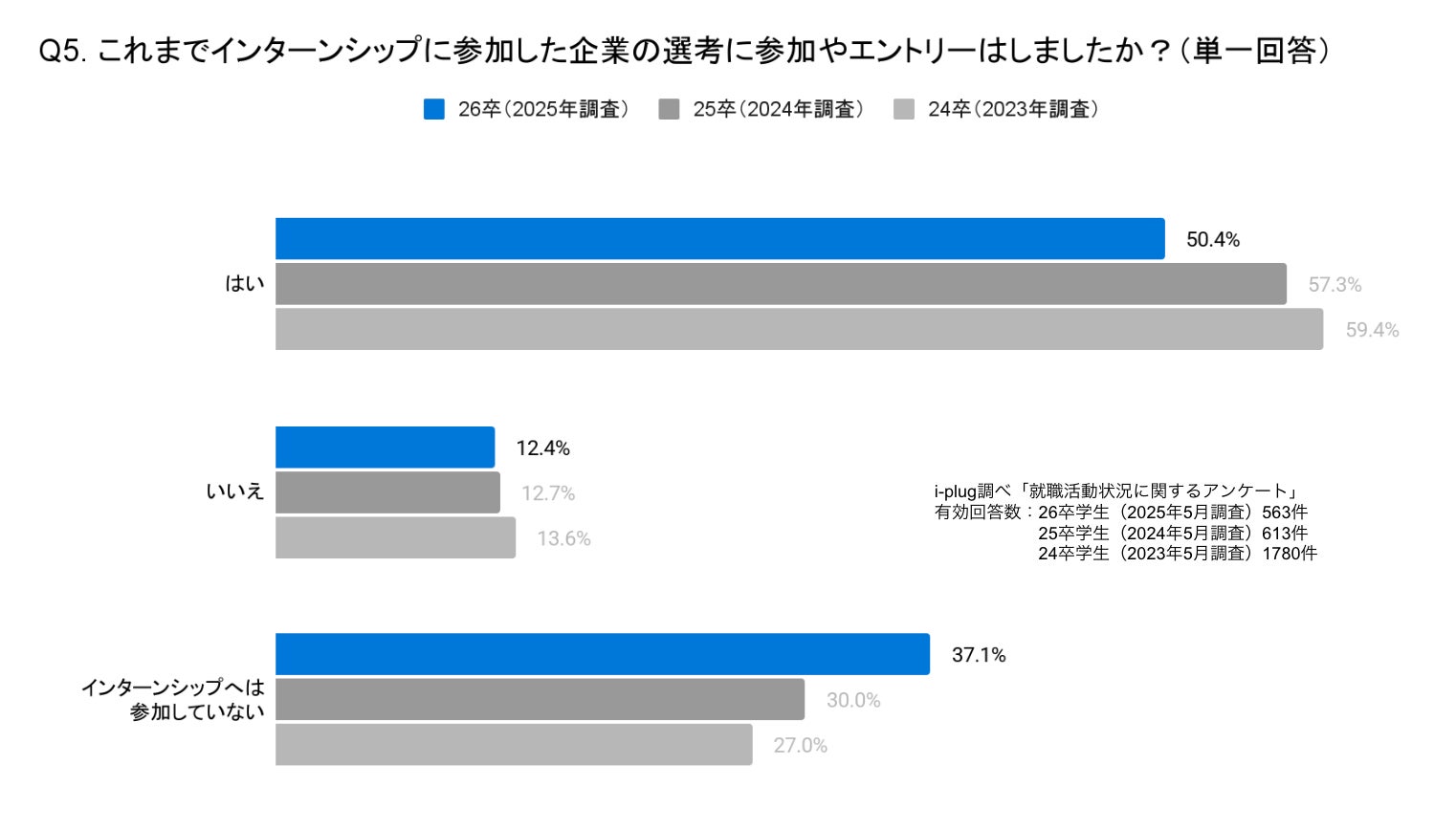「インターンシップに参加した企業の選考に参加やエントリーをしたか」の設問について、26卒学生の50.4%が「はい」と回答。半数の学生が「はい」と回答していることから、インターンシップの参加が、企業の選考への参加やエントリーにつながることが推察できます。
