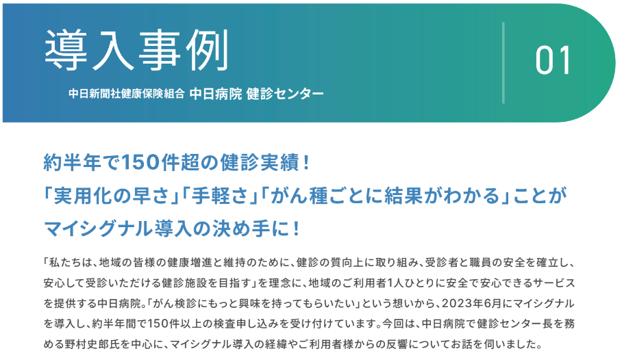 「マイシグナル®︎」は、2022年2月のサービス開始以来、全国の総合病院、健診施設、クリニックなど、さまざまな医療機関に導入されてきました。開始から2年が経過し、巡回健診や企業健診への組み込みを行う医療機関も増え、より幅広い場面での活用が進んでいます。また、この検査は特別な設備や人材を必要とせず提供できるという点も取り組む医療機関が増えている理由の一つです。Craifは今後も、医療機関にも受検者にも負担が少ない検査として「マイシグナル®︎」を推進し、がんの早期発見や早期治療に貢献してまいります。