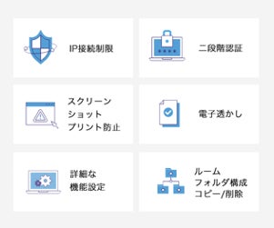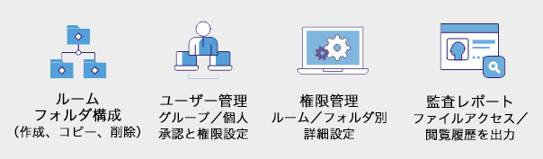 テーマごとにルームを完全に分離して使用することができ、ユーザー/ルーム/フォルダ別の詳細な権限設定で承認された関連者のみが機密文書にアクセスできます。