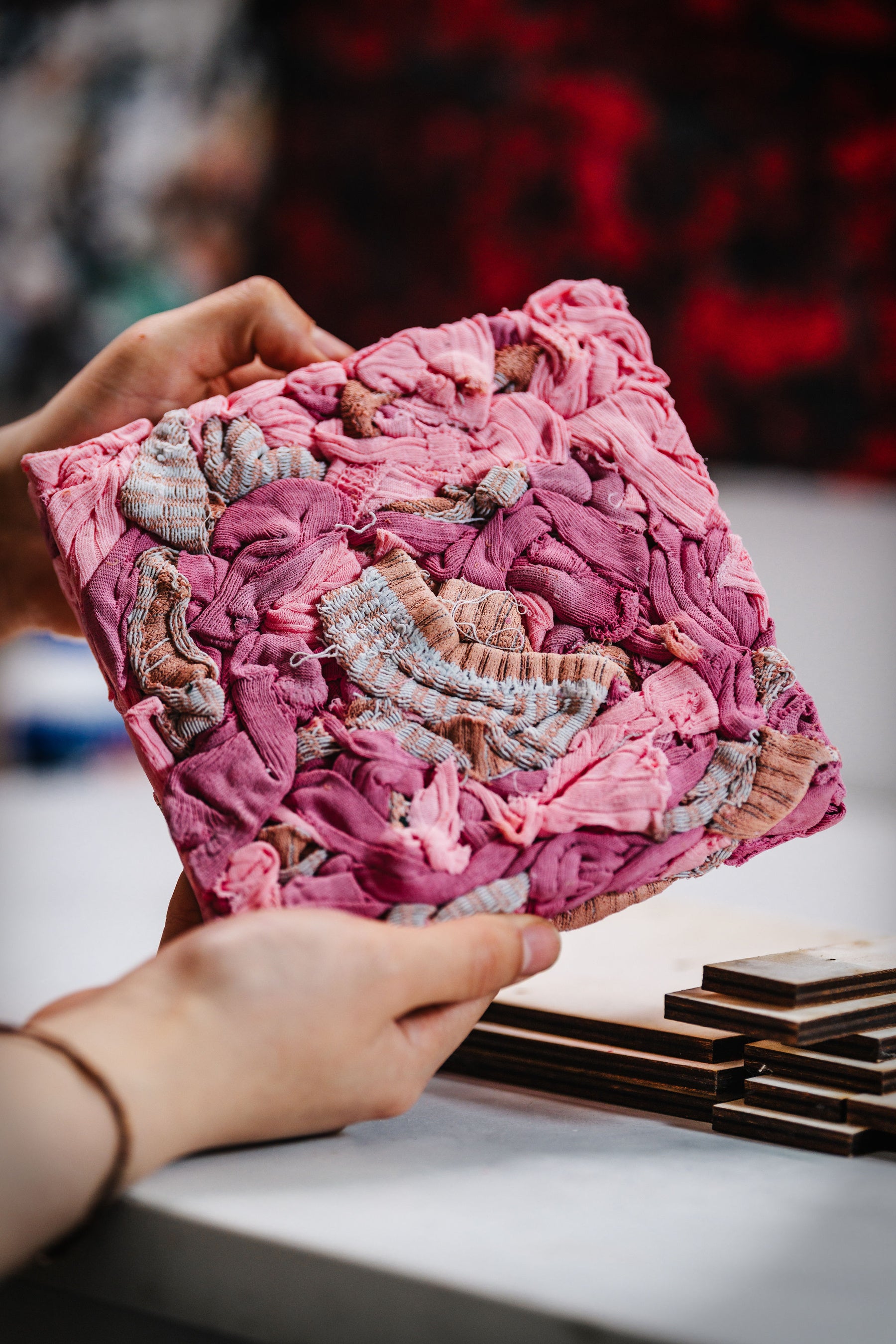 シュレッダーで裁断された繊維廃棄物を活用したサステナブルな音響パネル。 |