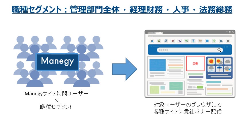 Manegyを訪れたユーザーに対して、Manegy外のサイトの広告枠に広告を配信します。Manegyの閲覧データをもとに職種セグメント単位(管理部門全体・経理財務・人事・法務総務など)でのターゲティングが可能なため、ターゲット外への無駄な配信が無く、効率の良い広告配信が可能です。