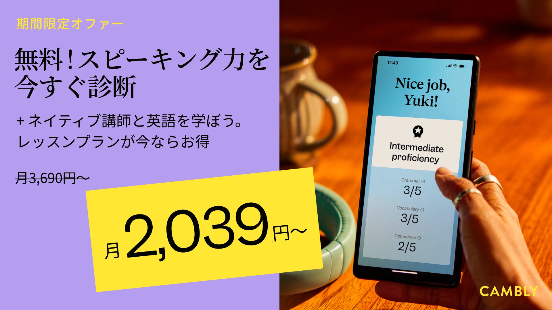 Cambly Inc.(本社:アメリカ・サンフランシスコ、日本代表:佐藤 亜希子)は、ネイティブ講師とのオンライン英会話サービス「CAMBLY(キャンブリー)」に、新しくAIを利用したレベルチェック機能を導入しました。無料で受けることができ、スピーキング力を診断、さらに個別のフィードバックとおすすめプランを提案します。さらに、本日7月16日(火)から期間限定で、月2,039円〜英会話をお得に始められるキャンペーンを開催中です。