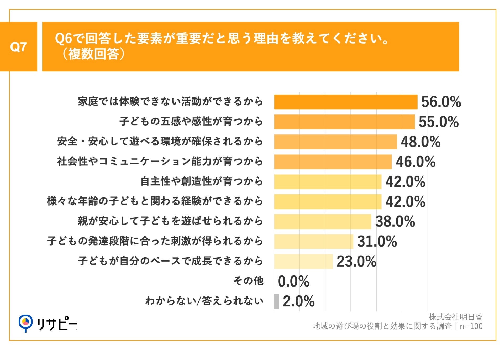 Q6で「わからない/答えられない」以外を回答した方に、「Q7.Q6で回答した要素が重要だと思う理由を教えてください。(複数回答)」(n=100)と質問したところ、「家庭では体験できない活動ができるから」が56.0%、「子どもの五感や感性が育つから」が55.0%、「安全・安心して遊べる環境が確保されるから」が48.0%という回答となりました。
