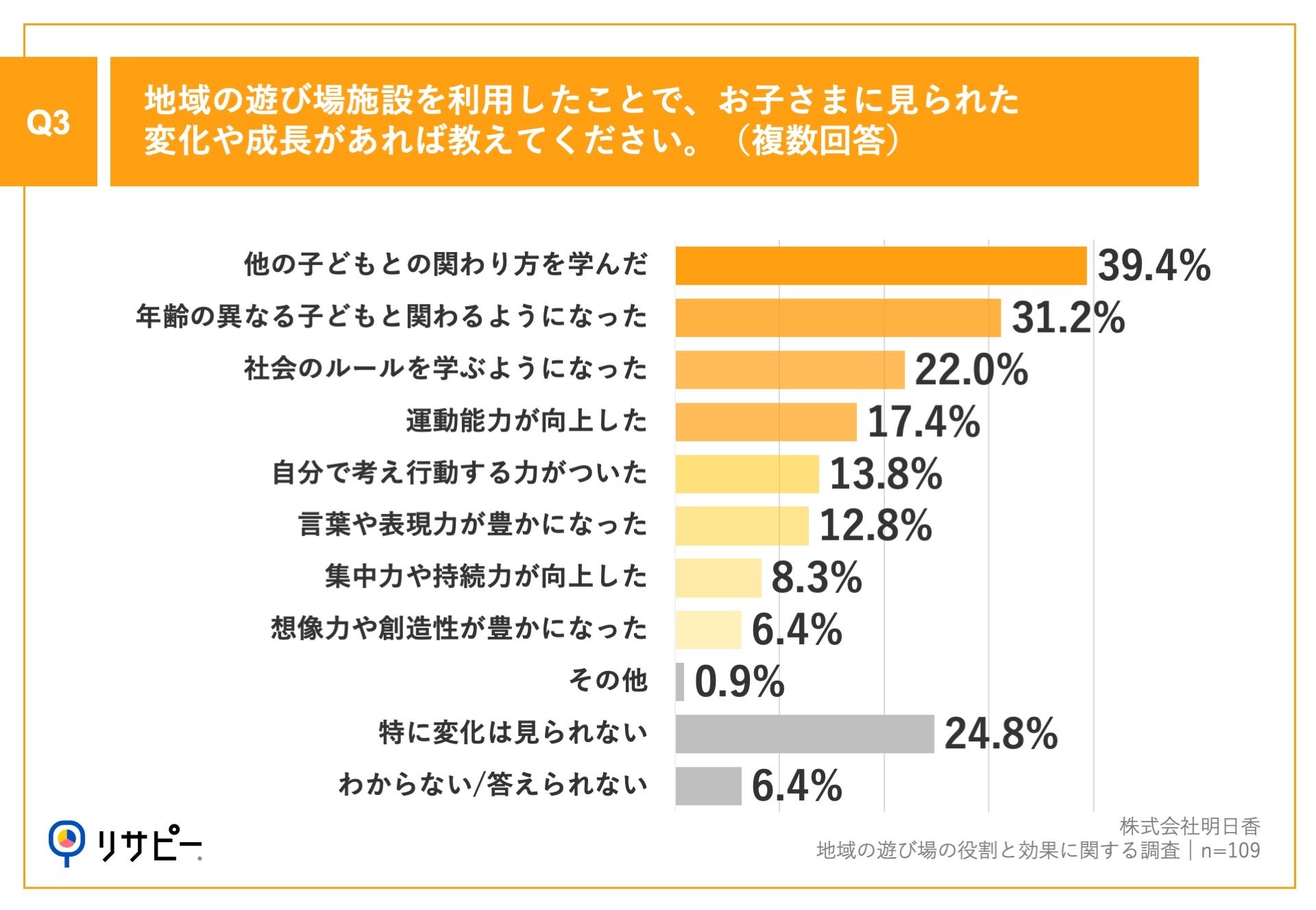 「Q3.地域の遊び場施設を利用したことで、お子さまに見られた変化や成長があれば教えてください。(複数回答)」(n=109)と質問したところ、「他の子どもとの関わり方を学んだ」が39.4%、「年齢の異なる子どもと関わるようになった」が31.2%、「社会のルールを学ぶようになった」が22.0%という回答となりました。