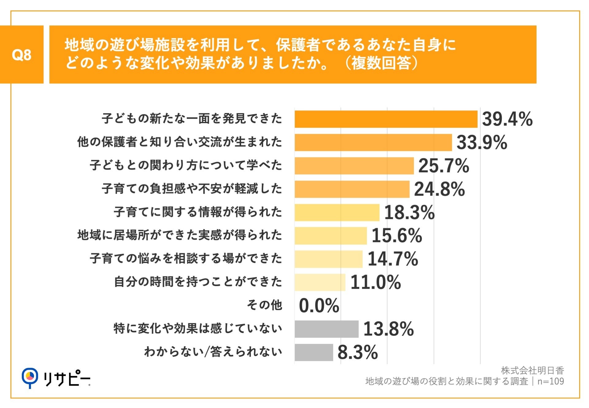 「Q8.地域の遊び場施設を利用して、保護者であるあなた自身にどのような変化や効果がありましたか。(複数回答)」(n=109)と質問したところ、「子どもの新たな一面を発見できた」が39.4%、「他の保護者と知り合い交流が生まれた」が33.9%、「子どもとの関わり方について学べた」が