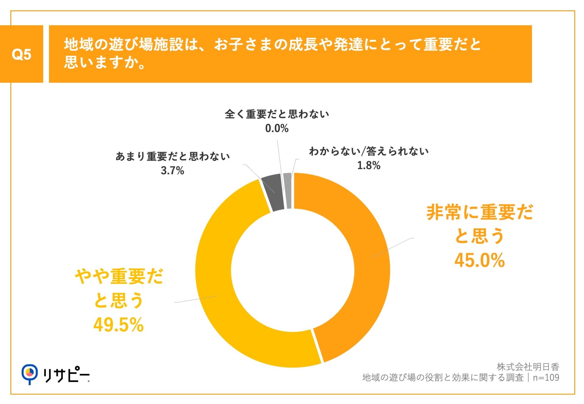 「Q5.地域の遊び場施設は、お子さまの成長や発達にとって重要だと思いますか。」(n=109)と質問したところ、「非常に重要だと思う」が45.0%、「やや重要だと思う」が49.5%という回答となりました。