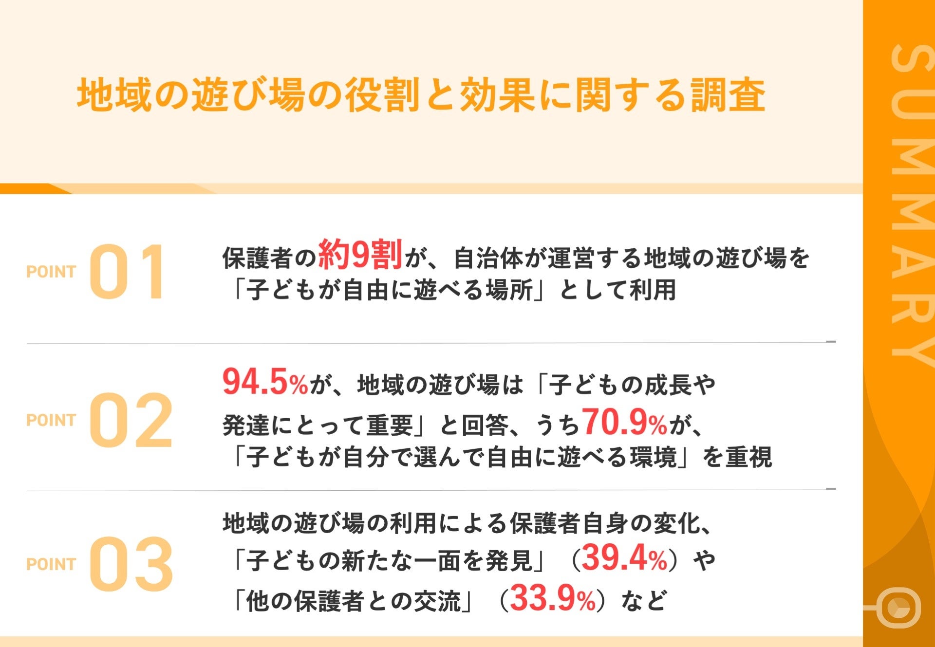 02|94.5%が、地域の遊び場は「子どもの成長や発達にとって重要」と回答、うち70.9%が、「子どもが自分で選んで自由に遊べる環境」を重視