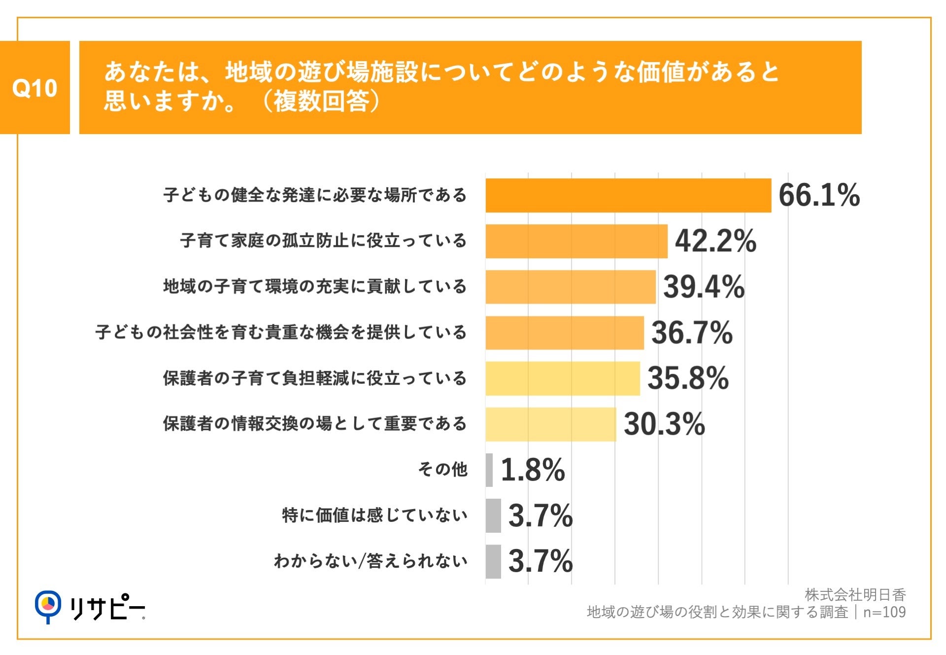 「Q10.あなたは、地域の遊び場施設についてどのような価値があると思いますか。(複数回答)」(n=109)と質問したところ、「子どもの健全な発達に必要な場所である」が66.1%、「子育て家庭の孤立防止に役立っている」が42.2%、「地域の子育て環境の充実に貢献している」が39.4%という回答となりました。