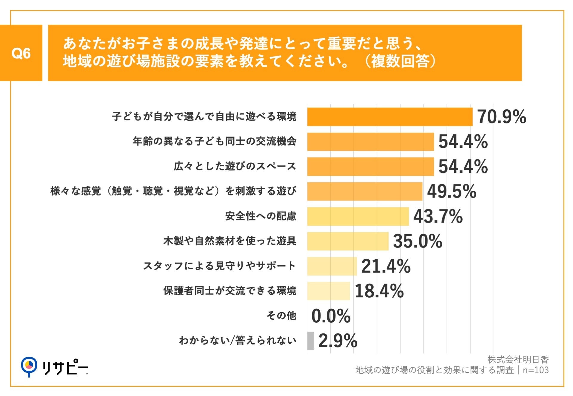 Q5で「非常に重要だと思う」「やや重要だと思う」と回答した方に、「Q6.あなたがお子さまの成長や発達にとって重要だと思う、地域の遊び場施設の要素を教えてください。(複数回答)」(n=103)と質問したところ、「子どもが自分で選んで自由に遊べる環境」が70.9%、「年齢の異なる子ども同士の交流機会」が54.4%、「広々とした遊びのスペース」が54.4%という回答となりました。