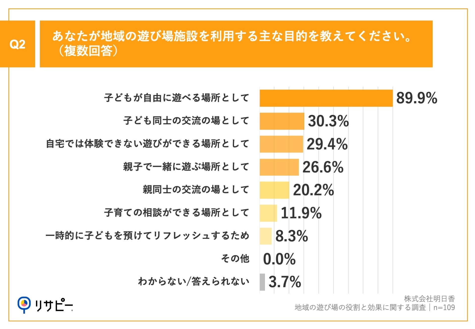 「Q2.あなたが地域の遊び場施設を利用する主な目的を教えてください。(複数回答)」(n=109)と質問したところ、「子どもが自由に遊べる場所として」が89.9%、「子ども同士の交流の場として」が30.3%、「自宅では体験できない遊びができる場所として」が29.4%という回答となりました。