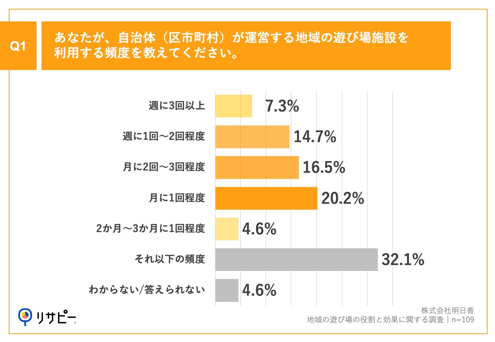 「Q1.あなたが、自治体(区市町村)が運営する地域の遊び場施設を利用する頻度を教えてください。」(n=109)と質問したところ、「月に1回程度」が20.2%、「月に2回~3回程度」が16.5%という回答となりました。