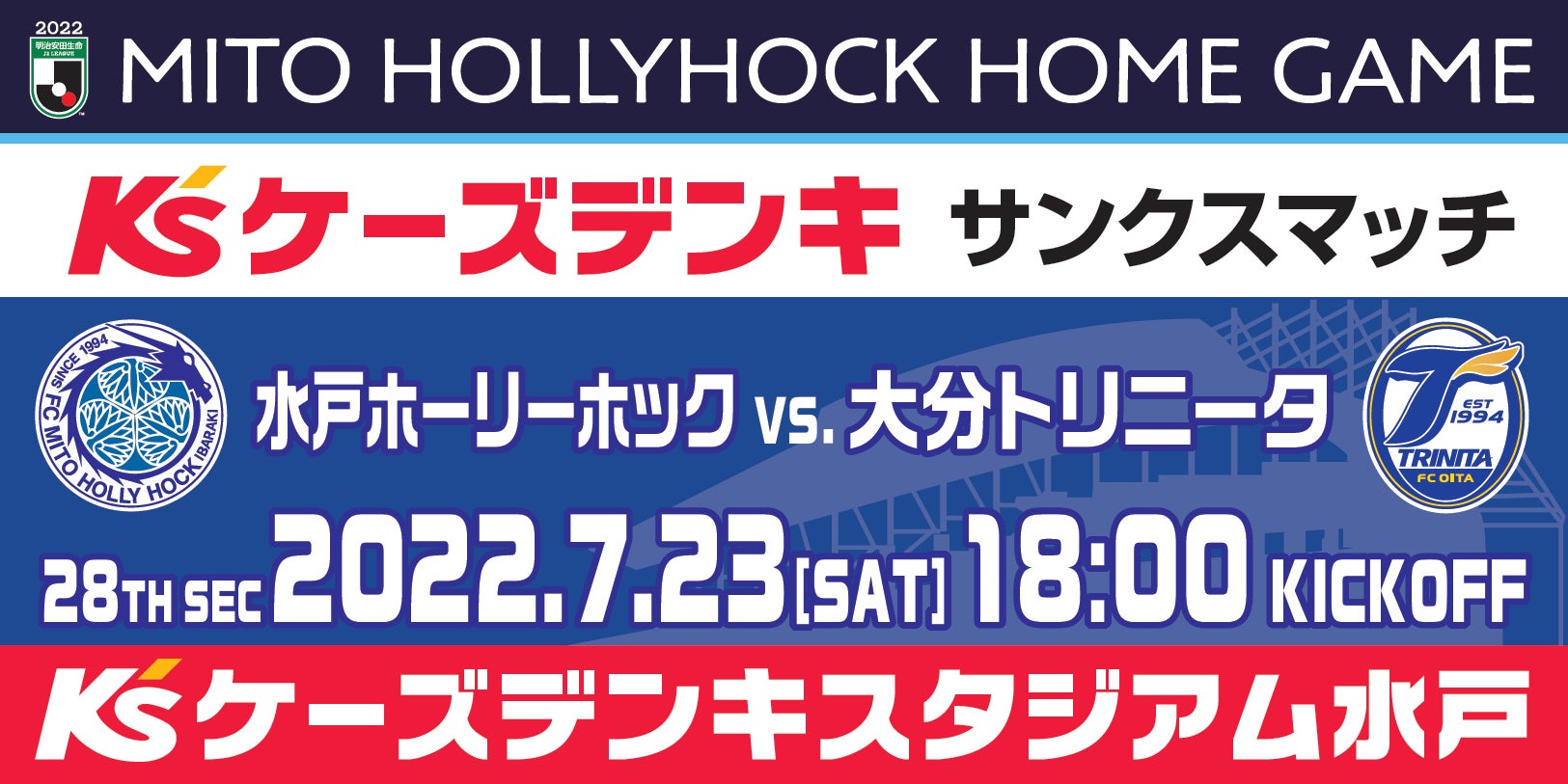 この度、7月23日(土)開催の2022明治安田生命J2リーグ第28節 大分トリニータ戦を、ケーズホールディングス様にご支援いただき『ケーズデンキサンクスマッチ』として開催することとなりましたので、下記の通りお知らせいたします。