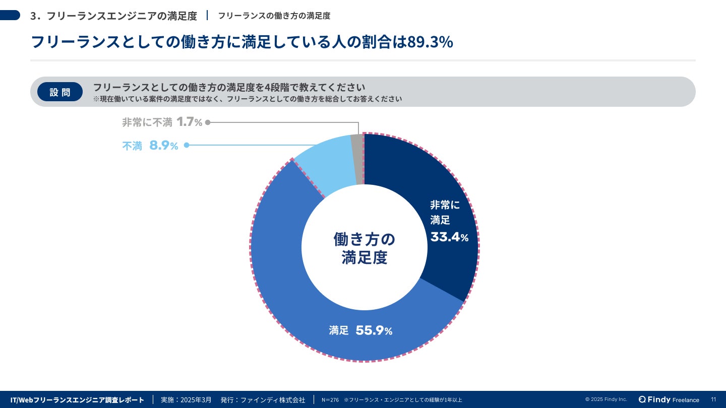 ・フリーランスとしての働き方に満足しているエンジニアの割合は89.3%であり、「新しい学びや経験」を得られている場合、特に満足度が高い。