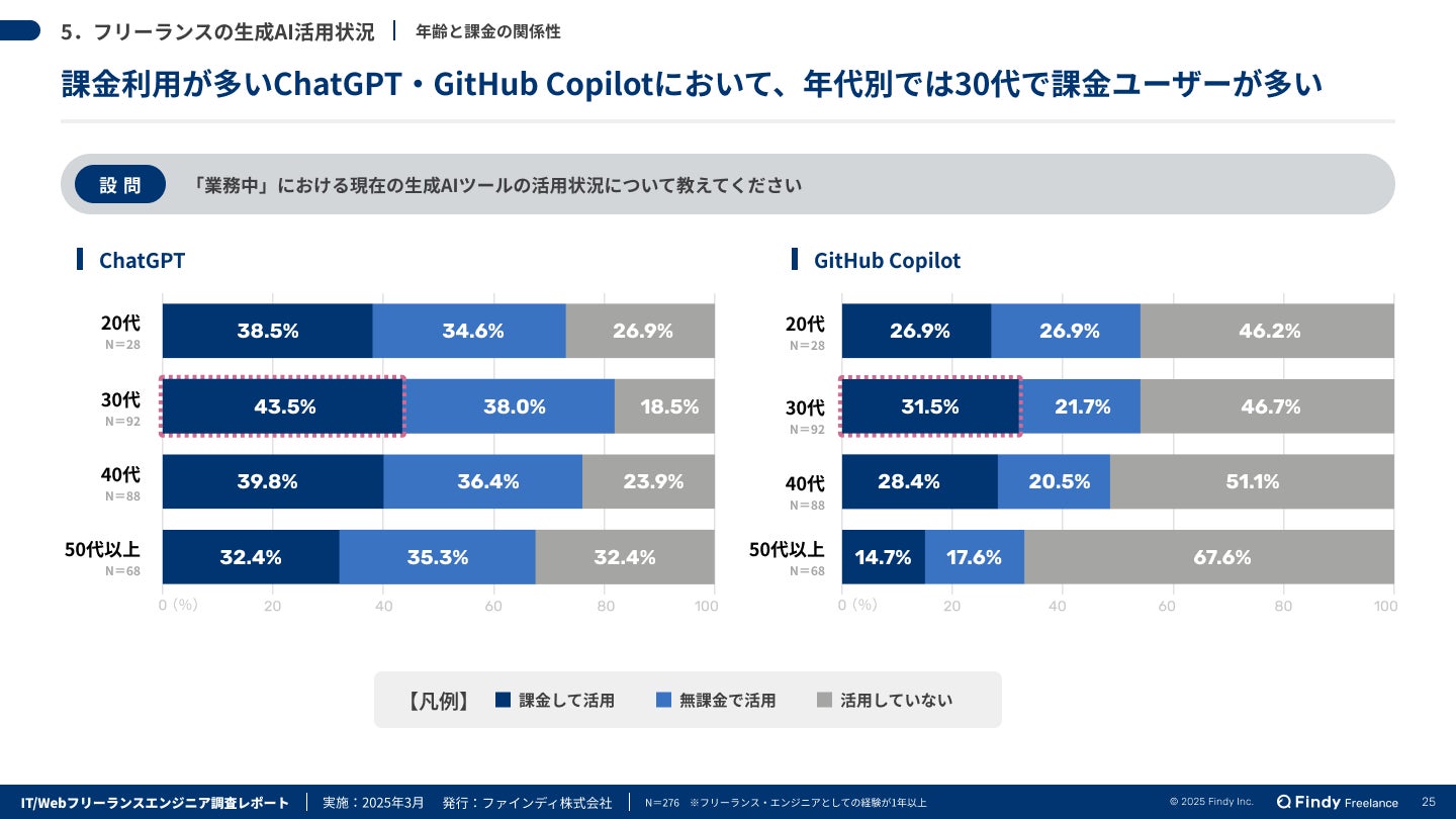 「ChatGPT」「GitHub Copilot」どちらも課金利用ユーザーは30代が最多という結果に。