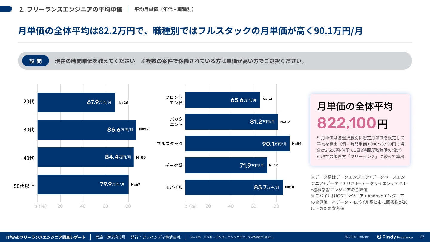 ・フリーランスエンジニアの平均月単価は82.2万円。職種別ではフルスタックエンジニアが月単価が90.1万円と最も高い結果に。